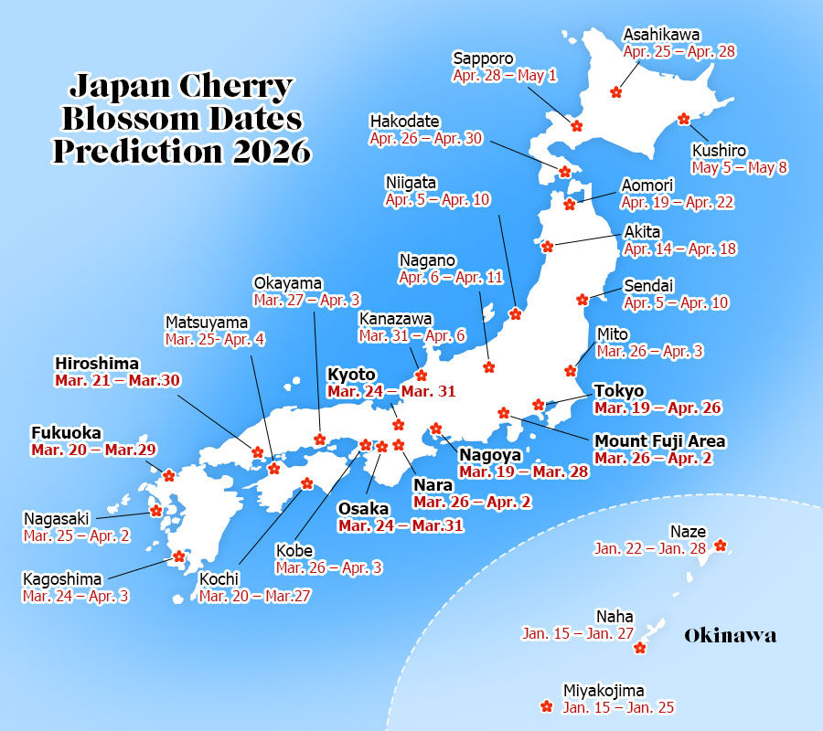 The predicted cherry blossom dates all over Japan in 2026 are listed by region below. In addition, the sakura dates 2025 are also available at last, which can be taken as a reference while planning your journey to Japan.