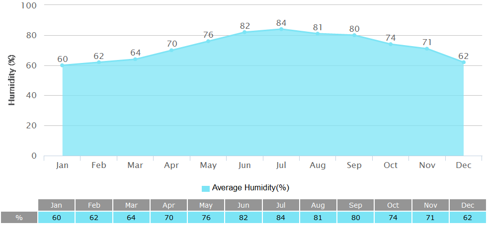 Ranging from 60% to 84%, the humidity in Shizuoka shows an obvious seasonal difference. Summer is pretty humid, and combined with high temperatures, people often feel muggy. Winter has the lowest humidity of around 60%, with dry and chilly air.