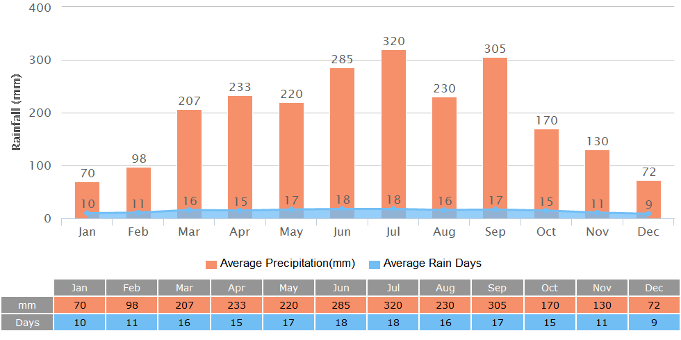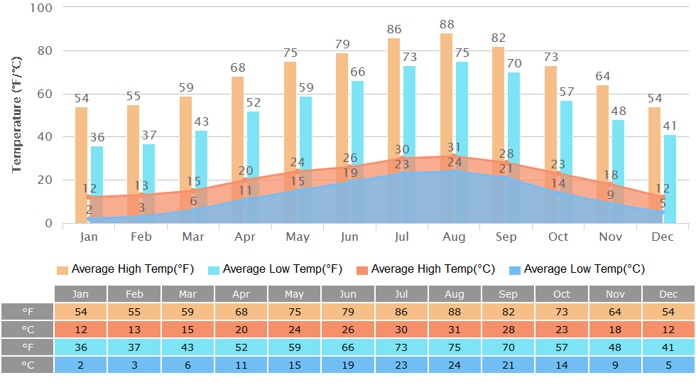 1. Wide year-round temperature span: the highest temperature can reach over 35℃ (95℉) in the hottest month August, while the lowest one drops to around 0℃ (32℉) in the chilliest month January.