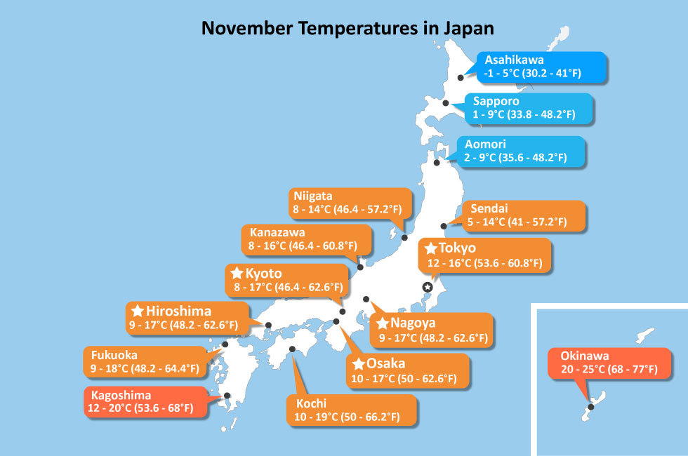 November is one of the best visiting months with beautiful fall foliage and pleasant overall Japan weather. Most cities have mild temperatures and see low precipitation, and Hokkaido is the only region that has relatively chilly climate and experiences many rainy or snowy days.Temperature