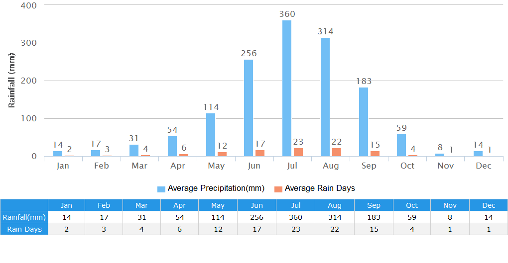 - Average Temperature: 11℃ - 24℃ (51.8℉ - 75.2℉)