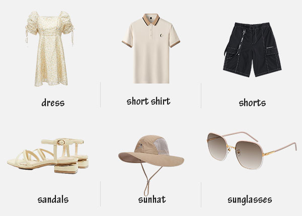 Clothes: Ladies can choose dresses, skirts, T-shirts, light pants and other summer clothes, while gentlemen can wear short shirts, shorts, etc.