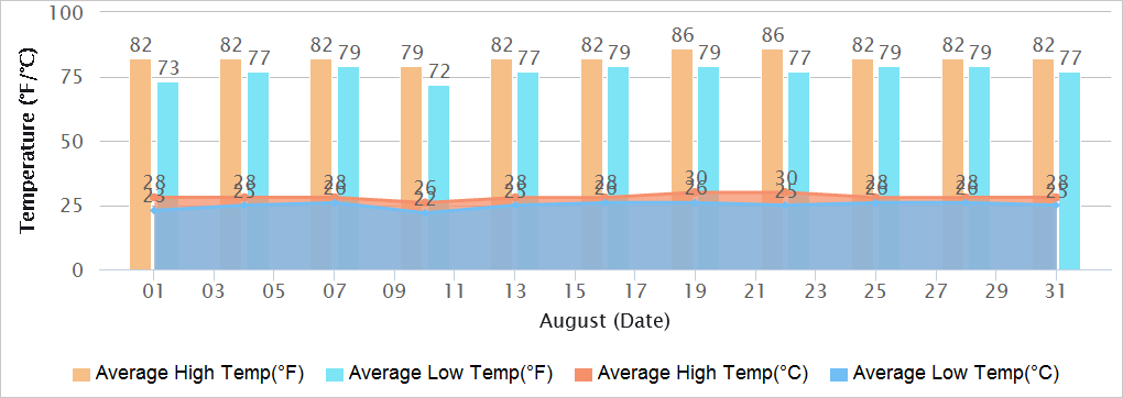 Some of the beach shacks reopens. Goa temperature in August between 26°C to 28°C (78.8°F to 82.4°F) in day and 25°C to 27°C (77°F to 80.6°F) at night makes the stay relaxing. Lush green surroundings of the swaying palm tree, coconut grove, interior forests of the national parks, and western ghats will surely impress you.