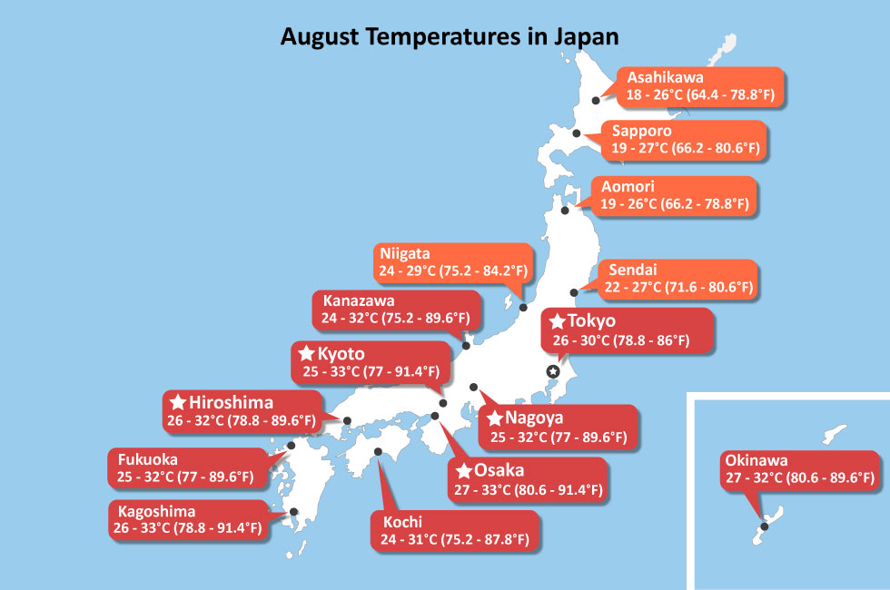 Southern cities like Okinawa are also quite hot, with temperatures ranging from 27 to 32°C (81-90°F) almost every day. On the bright side, however, the sea temperature here reaches around 29°C (84°F) this month, very warm for water activities.