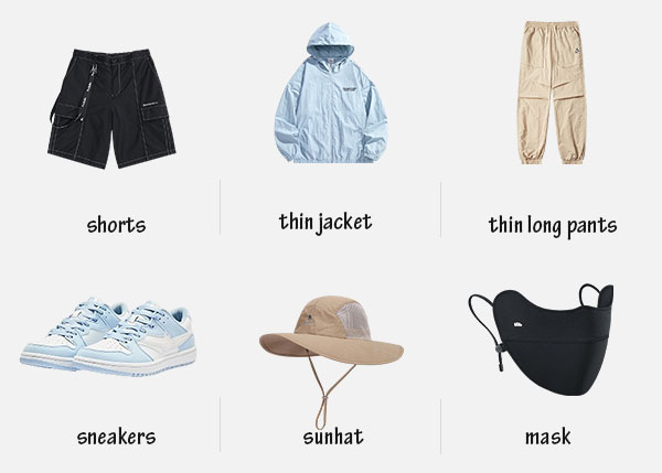 Clothes & Shoes: Beautiful and cool summer outfits like dresses and tank tops plus skirts for females and sleeveless T-shirts plus shorts for males are recommended when you go to the beach. As for shoes, you can choose sandals, flip-flops, or water shoes. When you go hiking in places like national parks, however, you are advised to wear thin long pants, T-shirts, plus thin sun protection jacket to protect your skin from the sunshine as well as mosquito bites. During hiking, lightweight and breathable sneakers or hiking shoes are more suitable. Moreover, a thin shirt is recommended to pack for cool nights and a swimsuit for water activities.