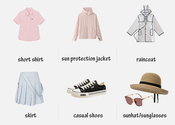 Bottoms: Both skirts and shorts can match well with your tops. For shoes, sandals are ok for beach tours while sneakers are better for visiting scenic spots in the wild.