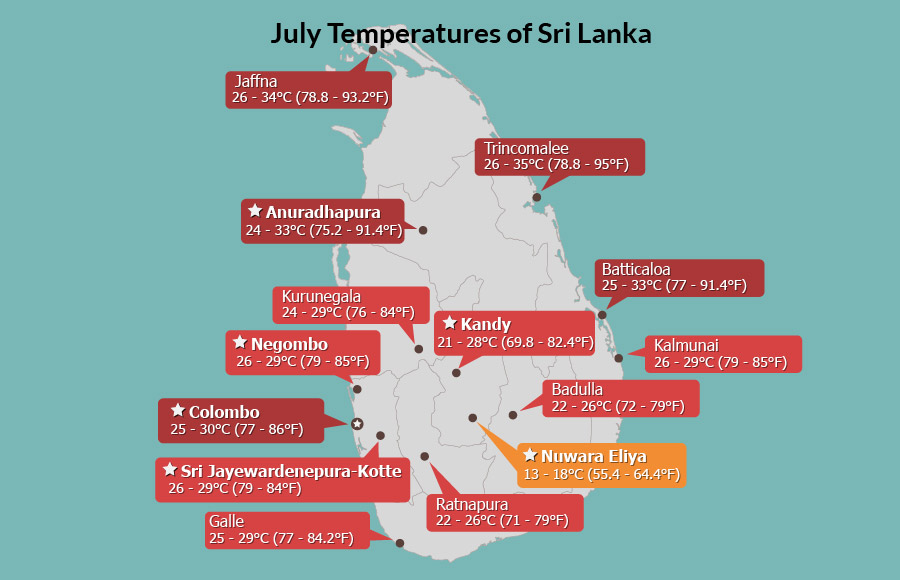 The coolest cities in Sri Lanka in July:Nuwaea Eliya: 13℃(55.4℉)