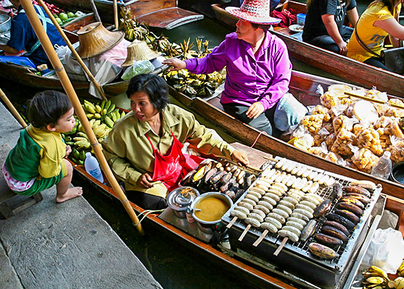 Night Market in Thailand The first destination of the day is the Damnoen Saduak Floating Market, about 100 km (62 mi) southwest of Bangkok, which is a bit far. The market wakes up and becomes active early, so if you want to visit it, you are advised to get up early and depart as early as possible. You can leave the hotel at 6:30 or 7:00, and take a taxi, bus, or hire a car to Damnoen Saduak. ► Precautions for taking a taxi or hiring a car:The Damnoen Saduak Floating Market is at least an hour and a half by car from downtown Bangkok. A round trip by taxi or chartered car costs about THB 1,500. Here are a few things you need to be aware of: 1. Before getting on the car, you need to negotiate the price with the driver in advance, and confirm whether it includes the highway toll fee and gas fee, so as to avoid being overcharged when getting off. 2. Use your mobile phone’s map app to search for the Damnoen Saduak Floating Market and insist that your driver drive you to the final destination, otherwise most drivers who are in cahoots with the unscrupulous merchants will drop you off at the unofficial boat terminals where you may get ripped off. Their private boats are very expensive, charging THB 1,000 a person or more. 3. In fact, the official Floating Market Boarding Place is only about 500 meters (550 yards) away from the above drop-off point. If your taxi driver refuse to send you to the official boarding place, you can walk 10 minutes or take a motorbike for THB 20 to get there. Be sure to find the real entrance of the Damnoen Saduak Floating Market. There is a bridge with a gable roof and yellow letters on it, and a 7-Eleven at one end. This is the real market gate and boarding place. From the bridge, you can see the spectacle of Thailand’s often photographed floating markets. ► Tips for bus travel:First you need to take a taxi or tuk-tuk from your hotel to the WASTONS New Southern Bus Terminal (Sai Tai Mai), which is integrated with a shopping mall SC Plaza. It takes 30 to 40 minutes and costs THB 100 to 150 by taxi from downtown Bangkok. From the ticket windows of this bus terminal, you can buy tickets of buses or mini vans to the Damnoen Saduak Floating Market. Buses and mini vans run every half hour from 5:30 in the morning. A ticket costs THB 64 to 90. It takes 2 hours for a single trip. When you get off at the terminal of the real entrance of the Damnoen Saduak Floating Market, you will be directed to the boat by the staff.