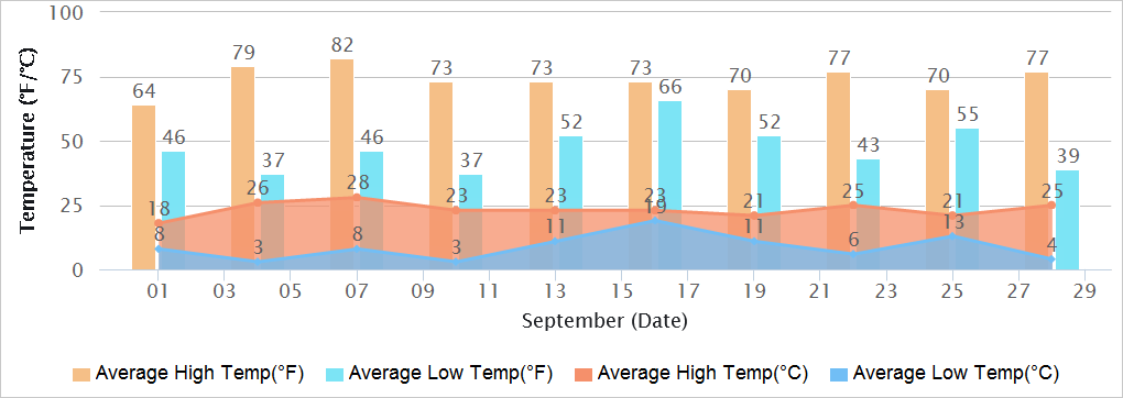 High Temperature: mostly ranging from 9 to 22 degrees Celsius (48 - 72 degrees Fahrenheit)Low Temperature: -1 to 8℃ (30 - 46℉)