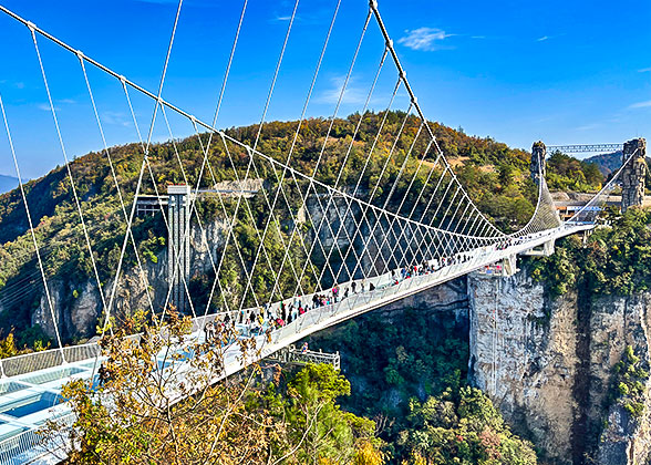 On the second day, we will go to Zhangjiajie Grand Canyon, reputed as the museum of Zhangjiajie landscape for its beautiful peaks, caves, streams and waterfalls. There is a veil of mist over the streams throughout the year, making this canyon resemble a fairyland. Then we will set off for an adventure at the world’s highest and longest glass bridge over the canyon. The bridge is about 535 meters (585 yards) long and 280 meters (305 yards) high from the bottom of the canyon. Then we will go sightseeing at Baofeng Lake by a boat. Surrounded by steep peaks, the lake is tranquil and picturesque with a waterfall pouring into it and an ancient temple hiding in the mountains. Meals: Western buffet breakfast, Lunch